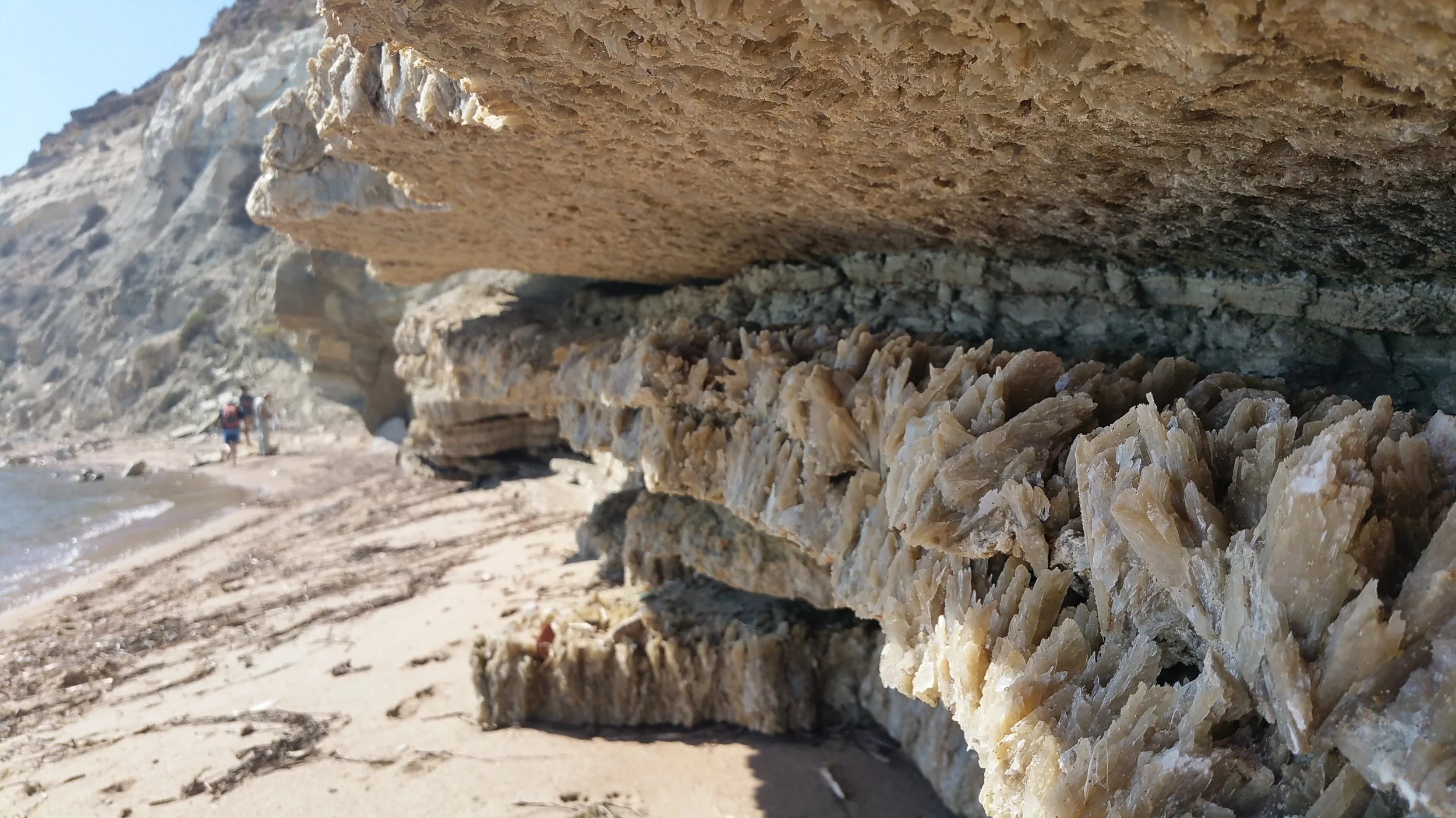 Gypsum crystals growing in a dovetail shape - show the orientation of bedding.